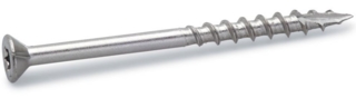Syrefast terrasseskrue med fiberskjærende cutterspiss og CS-spor under skruehodet. Bruksområde: Terrasse, brygge, espalier, gjerder og paneler utendørs. Materiale: Rustfritt syrefast A4 stål, korrosivitetsklasse C5.