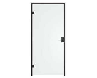 En slank og solid dørkarm i aluminium for en enkelt dør, eller en tredør med sidelys, i en Decibel lydreduserende glassveggløsning.