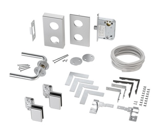 Et komplett monteringssett for Decibel-dørkarmen, med alle de små tingene som trengs for å montere glassdøren, inkludert den fleksible Easy RG-461-låskassen.